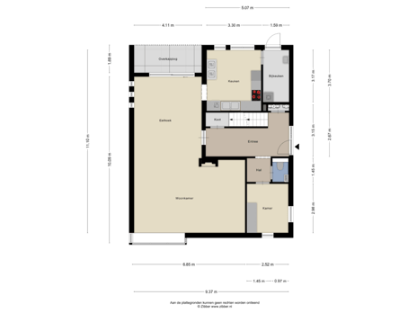 Deze zijde van de woning biedt bovendien uitstekende mogelijkheden tot uitbouw. De fundering en buitenmuren met spouw zijn reeds aanwezig, waardoor het eenvoudig is om de woonkamer verder te vergroten en een royale open woonkeuken met kookeiland te creëren.