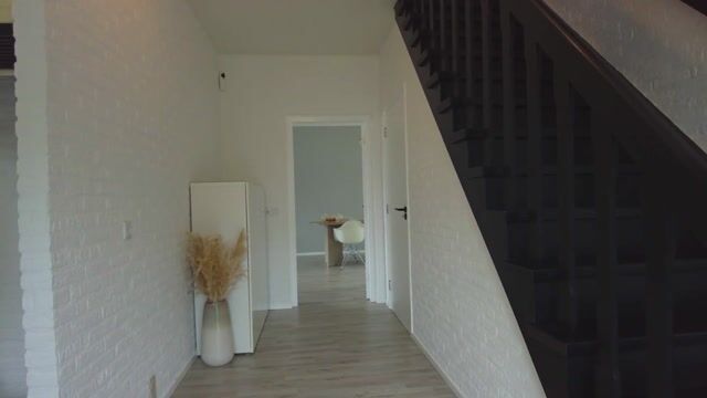 Via de diepe oprit kom je binnen in de ruime hal van de woning. Hier ligt een fraaie laminaatvloer die naadloos doorloopt over de gehele benedenverdieping, wat zorgt voor een mooi geheel en een rustige uitstraling. In de hal vind je de trapopgang met de stijlvolle houten trap naar de eerste verdieping, een handige nis met garderobe, en voldoende ruimte voor een dressoir of extra opbergmeubel.