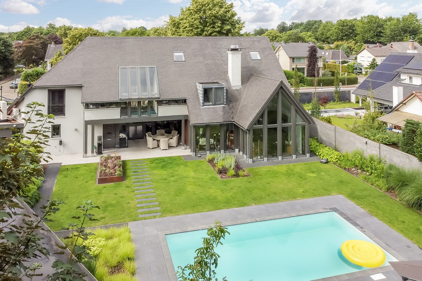 - Airconditioning, alarminstallatie, glasvezelkabel, mechanische ventilatie, rolluiken, zonnepanelen, en zwembad