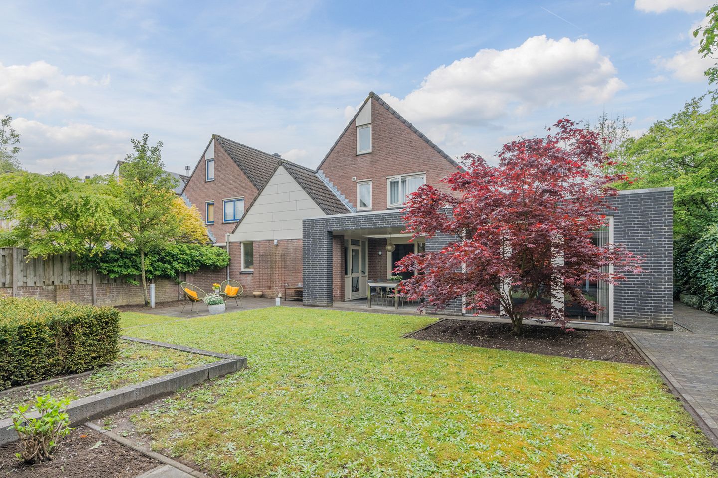 De privacy biedende onderhoudsvriendelijke achtertuin is ruim 14 m diep en op het zonnige westen gelegen. De tuin is onder architectuur ontworpen en op speelse wijze zijn de belijningen van het huis en de aanbouw gespiegeld in het tuinontwerp. Diverse bloembedden liggen klaar om beplant te worden. De tuin heeft meerdere (overdekte) terrassen. Bij zonneschijn kan er op ieder uur van de dag een plekje in de zon of juist in de schaduw worden gevonden. De overkappingen aan het huis en bij het tuinhuis geven ook bij regen een beschutte plek om buiten te zitten. Het verlichtingsplan is weldoordacht uitgevoerd, zodat de tuin in het donker fraai wordt verlicht. Via een eigen achterom naast de woning is de tuin te bereiken.