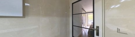 De masterbedroom, gelegen aan de achterzijde van het appartement, biedt via openslaande deuren directe toegang tot de woonkamer, wat zorgt voor een prettige verbinding tussen de ruimtes. De kamer is keurig afgewerkt en grenst aan de stijlvol uitgevoerde badkamer met fraai tegelwerk, een ruime douche met comfortabele zitplek en een moderne dubbele wastafel die zorgt voor extra gebruiksgemak. Apart van de badkamer bevindt zich het toilet, afgewerkt met keurig tegelwerk en voorzien van een fonteintje en een modern, zwevend toilet.