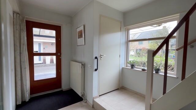 De hal geeft toegang tot de meterkast, trapopgang naar de eerste verdieping en het toilet. Een (brede) schuifdeur geeft toegang tot de woonkamer.