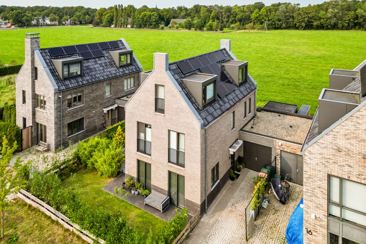 Dankzij de niet al te hoge tuinomheining geniet je vanuit de eigen tuin van een weids uitzicht over een weiland (met grazende koeien!) en daarachter een bos. Verder maakt ook de voortuin over het algemeen een groene indruk. Bovendien profiteer je hier van volop parkeergelegenheid op de eigen inrit.