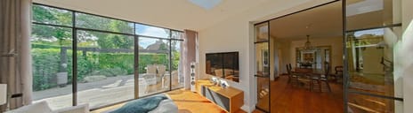 Dat de woning in balans is met de tuin blijkt ook wel uit de vele zichtlijnen maar ook toegangen die er zijn tot de tuin, vanuit de slaap/werkkamer naar een heerlijk terras aan de voorzijde op het zuiden, vanuit de keuken door de sfeervolle boog naar de achtertuin met de nieuwe veranda en tuinkamer en vanuit de serre naar een prachtig terras op het zuiden.