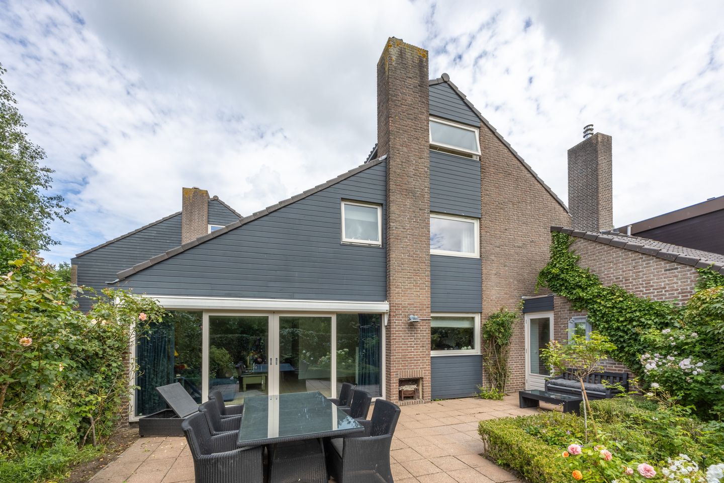 - Fraai aangelegde achtertuin met veel groen, terras, buitenhaard en elektrisch zonnescherm