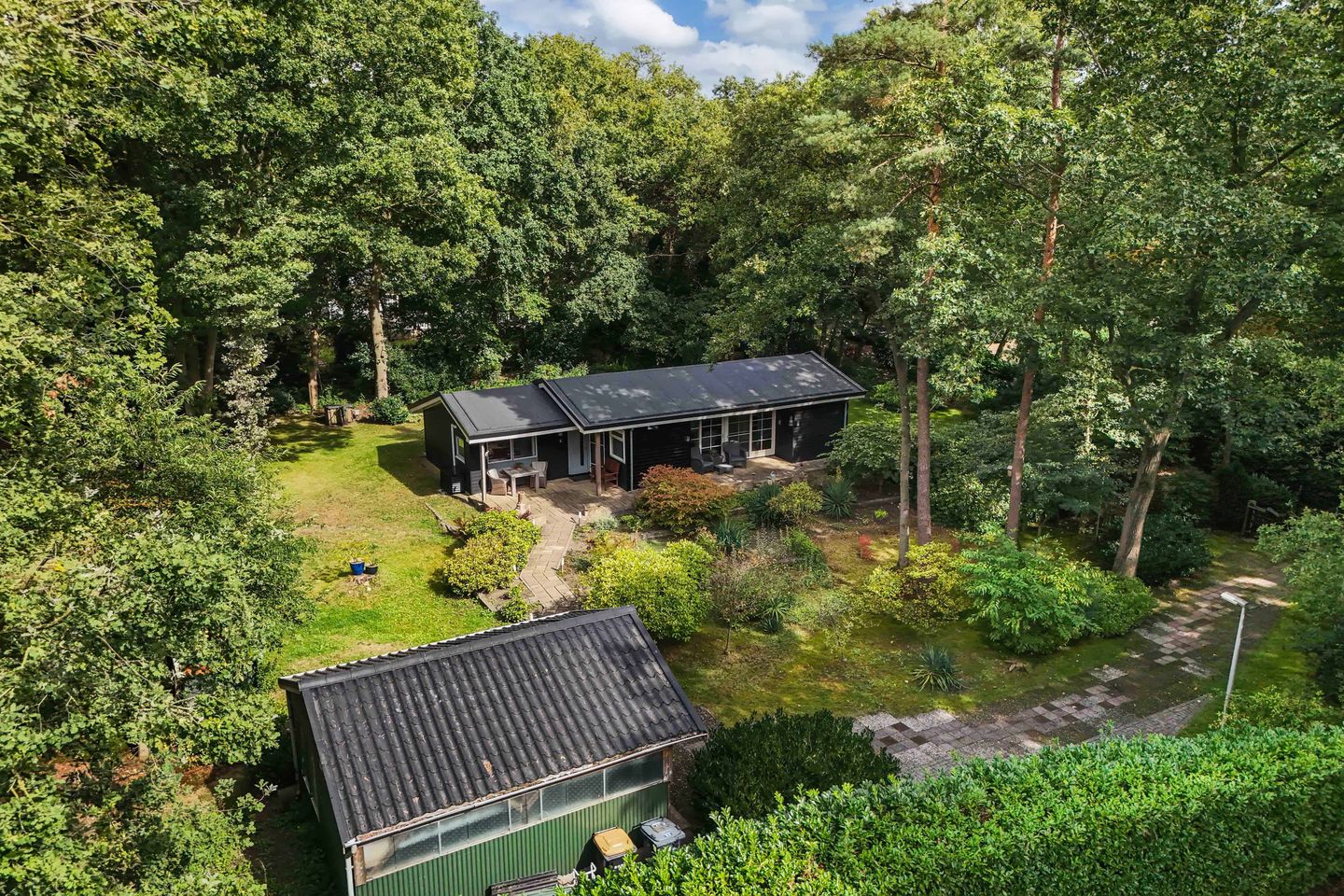 Het perceel is een open plek in het bos, met veel licht en volledige privacy. De omringende begroeiing zorgt voor een natuurlijke afscheiding van de buren. De zonnige tuin rondom de woning heeft diverse terrassen en biedt een gevarieerde beplanting. Daarnaast is er een royale oprit met parkeergelegenheid voor meerdere auto’s en een dubbele carport.