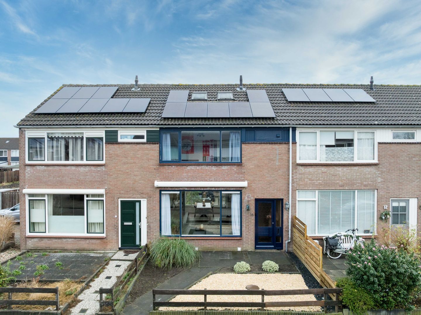 De voortuin is een heerlijk beschut plekje, door het groen en de elektrische buitenzonwering, waar je geniet van de ondergaande zon.