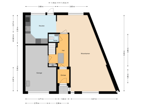 Ruime hal/entree met trapopgang, meterkast en toiletruimte met een handwasbakje. Vanuit de hal is er tevens toegang tot de inpandige garage met een wateraansluiting en een elektrisch bedienbare sectionaaldeur naar de voortuin, waar ook parkeergelegenheid is voor de auto.