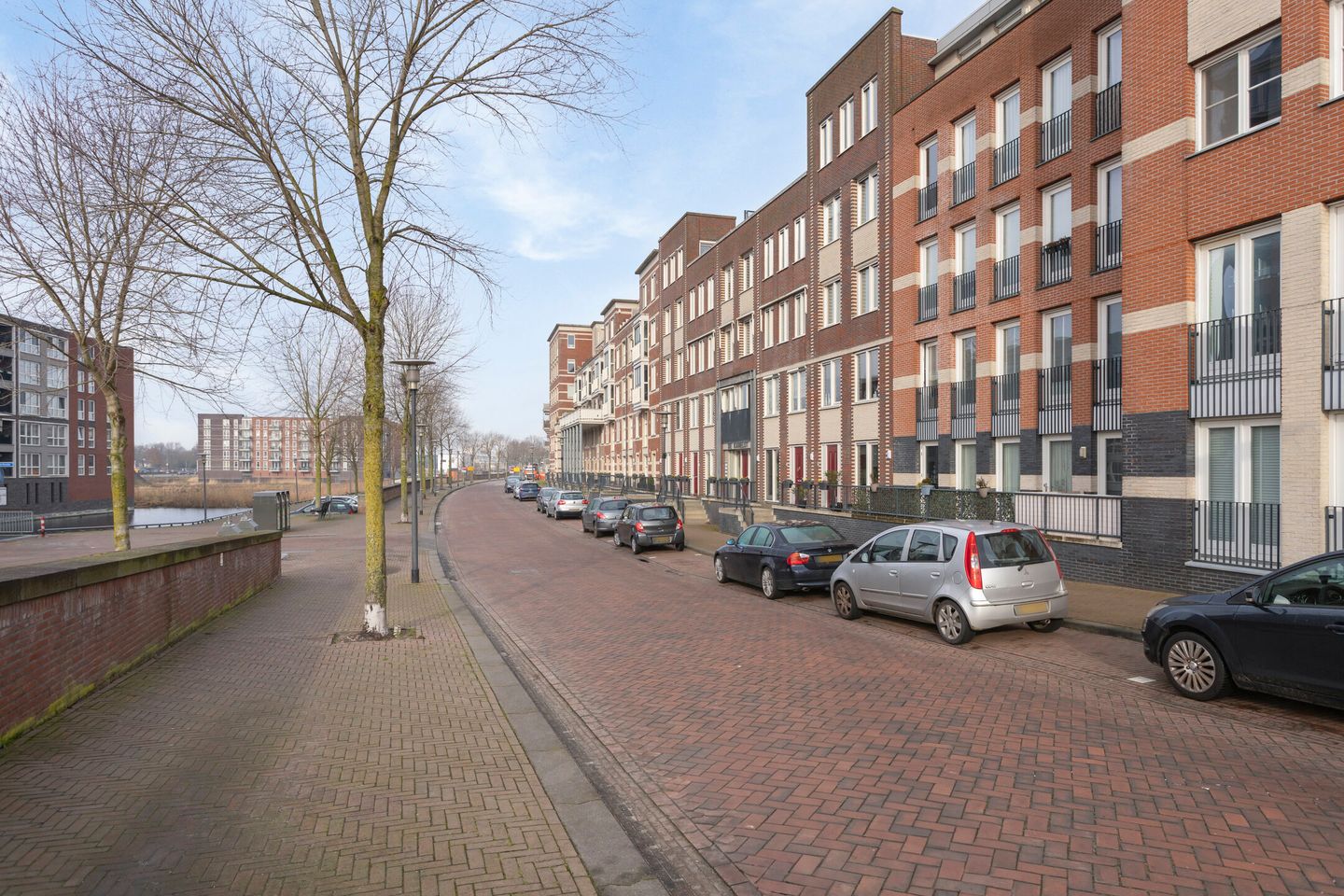 Ruime entree van de woning met videofooninstallatie, toilet met fonteintje en toegang tot alle overige ruimtes. Wat direct opvalt is de hardhouten parketvloer die drempelloos alle ruimtes met elkaar in verbinding brengt. De lichte woonkamer met fijn zicht op kade is praktisch vormgegeven en is semi afgescheiden van de eetkamer en keuken. Alle wanden zijn keurig afgewerkt met spachtelputz. De gehele woning is voorzien van glas- en overgordijnen een neutrale kleur. De ramen van de woonkamer zijn overigens voorzien van elektrisch bedienbare screens.