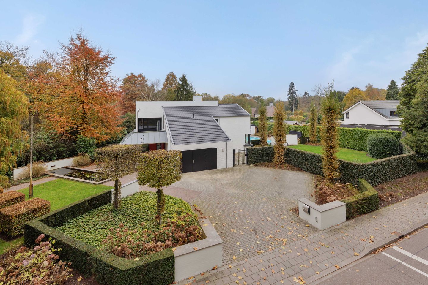 De grote voortuin is ingericht met borders voorzien van vaste beplanting, enkele beuken kubussen, groot gazon, vijverpartij en als erfafscheiding een taxus,- en klimophaag. De ruime oprit is voorzien van penanten inclusief verlichting. De stalen poorten aan de linker,- en rechterzijde van de woning bieden toegang naar een achterom.