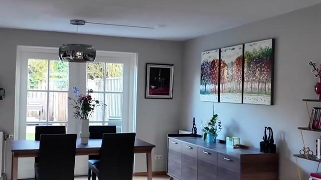 The living room is spacious and bright, with large windows at the front. There is spacious space for a comfortable seating area and the wooden floor creates a warm and homely atmosphere. At the rear, the dining area and kitchen are located. The French doors provide a smooth connection between indoor and outdoor living.