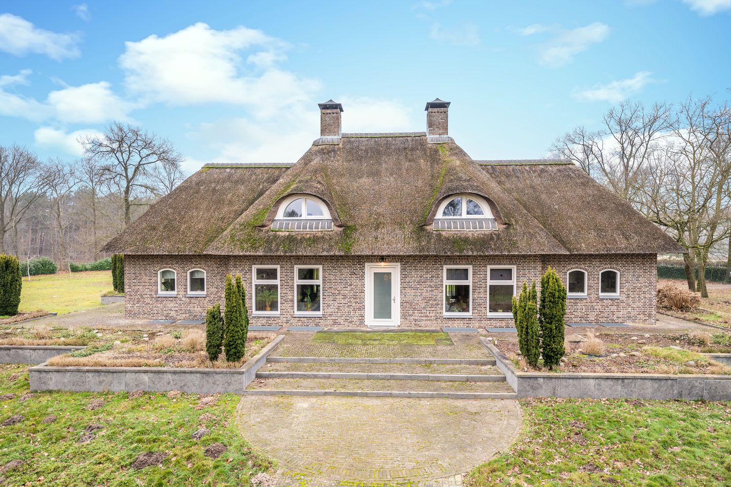 Op uniek bosrijk perceel, in parkachtige sfeer gelegen op circa 25.000 m², jong, rietgedekt, vrijstaand landhuis met buitenzwembad en bijgebouwen.