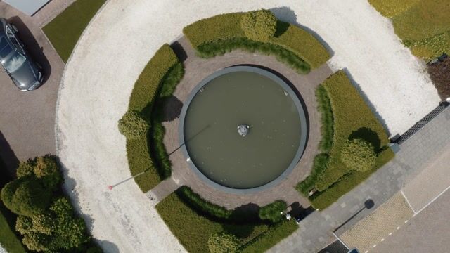 Middels de twee tuinpoorten toegang tot de drie parkeerplaatsen op eigen terrein en in het midden van de voortuin bevindt zich een prachtige vijverpartij met fontein. Het gazon aan de voorzijde is uitgevoerd in kunstgras.