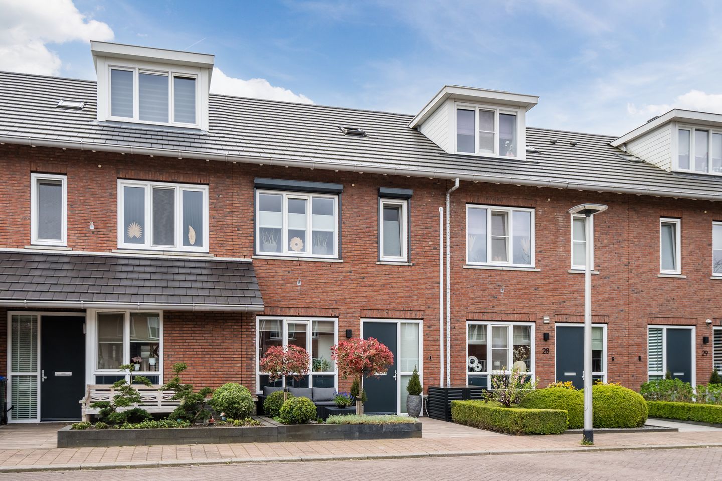 De voor- en achtertuin zijn verzorgd en aantrekkelijk aangelegd. In de voortuin vind je een gezellig zitje met sierlijke borders. De achtertuin heeft een moderne en strakke uitstraling met twee terrassen, een fijne speelplek met kunstgras en voldoende ruimte om zowel van zon als schaduw te genieten. De tuin beschikt daarnaast over een houten berging, een elektrisch zonnescherm en rolluiken op de eerste verdieping.