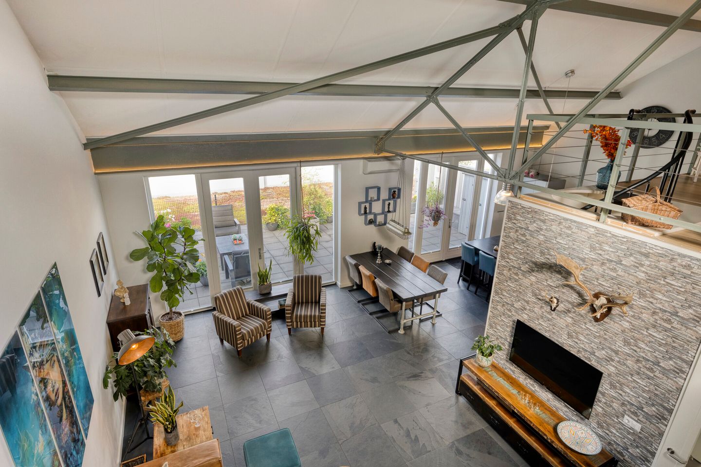 De loftwoning beschikt over een royale woonkamer met grote raampartijen, die zorgen voor veel lichtinval en een prachtig uitzicht op het dakterras. Dankzij het vrije zicht en de hoge plafonds ademt de ruimte luxe en openheid, waardoor het appartement de uitstraling en beleving van een penthouse krijgt.