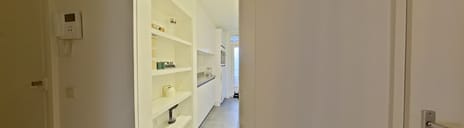 Vanuit de hal is de dichte keuken bereikbaar, voorzien van een luxe en verzorgd uitgevoerde inbouwkeuken. Het kunststof aanrechtblad met RVS spoelbak wordt aangevuld met diverse inbouwapparatuur, waaronder een 4-pits elektrische kookplaat, RVS afzuigkap, combimagnetron, koelkast en vaatwasser. Aangrenzend bevindt zich het tweede balkon op het noordoosten, eveneens bereikbaar via openslaande deuren.