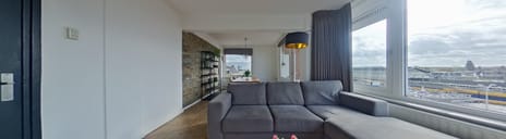 * Ruime woonkamer met een fraai, open uitzicht over het Stationsplein.