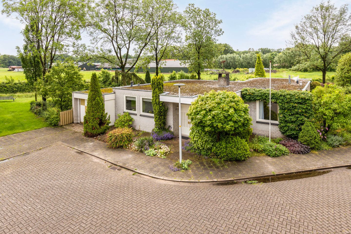 Aan de zijkant van de bungalow ligt de aangebouwde stenen garage met elektrische garagedeur en een separate toegangsdeur. De tuin is rondom de bungalow gelegen, waarbij de hoofdtuin zich bevindt aan de achterzijde en biedt een heerlijke vrije ligging met fantastisch vrij uitzicht over het groen en groot terras welke deels is overdekt.