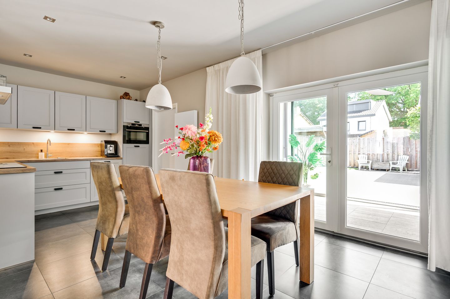 De leefkeuken (2020) is strak, modern en voorzien van hoogwaardige inbouwapparatuur. Of je nu een snelle maaltijd wilt bereiden of uitgebreid wilt koken voor vrienden en familie, hier heb je alle ruimte en gemak.