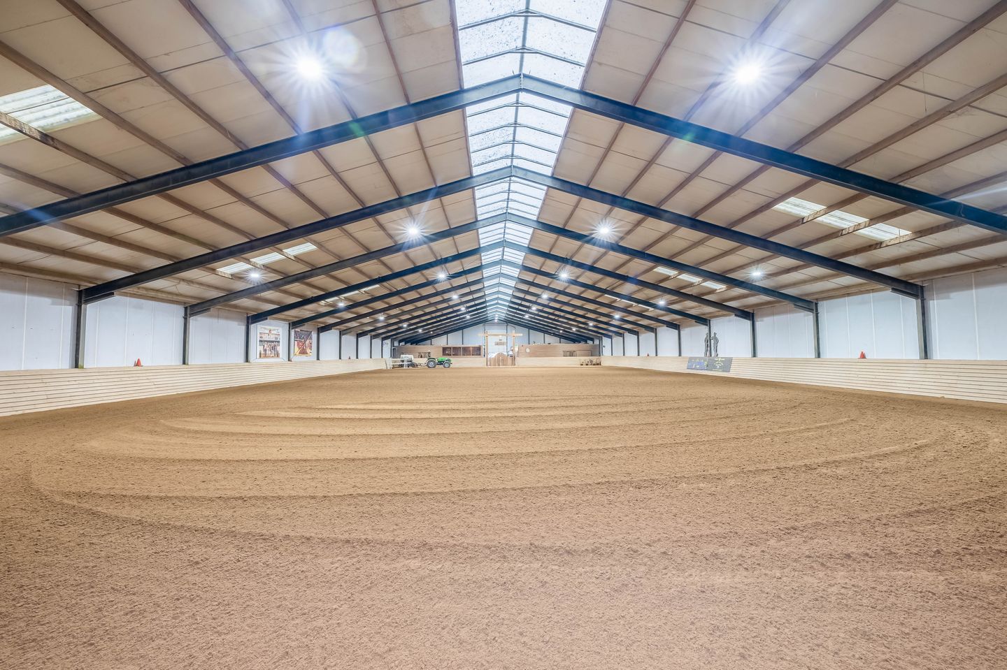 De binnenpiste (ca. 30x60 mtr.) is voorzien van een reining bodem en wordt omringd door een houten bakrand. De hal is opgetrokken met stalen spanten en de gevels en het dak zijn voorzien van geïsoleerde sandwichpanelen. In de nok van het dak is een lichtstraat aangebracht. Van de binnenpiste is het erf bereikbaar middels schuifdeuren in de achtergevel en zijgevel. Er is 1 verwarmde zadelkamer en 1 verwarmde dekenkamer aanwezig met volop bergruimte. De wasplaats met solarium biedt ruimte aan 2 paarden en er is warm en koud water aanwezig. De praktische voerruimte is voorzien van een betonnen vloer, metselwerk en betimmerde wanden en een houten balken plafond.