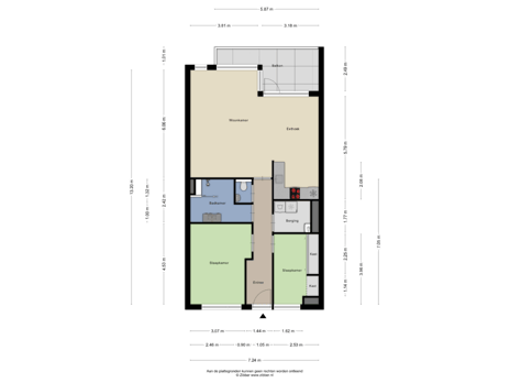 Via de galerij bereikt u de voordeur van het appartement. De ontvangsthal biedt toegang tot alle vertrekken en de meterkast.
