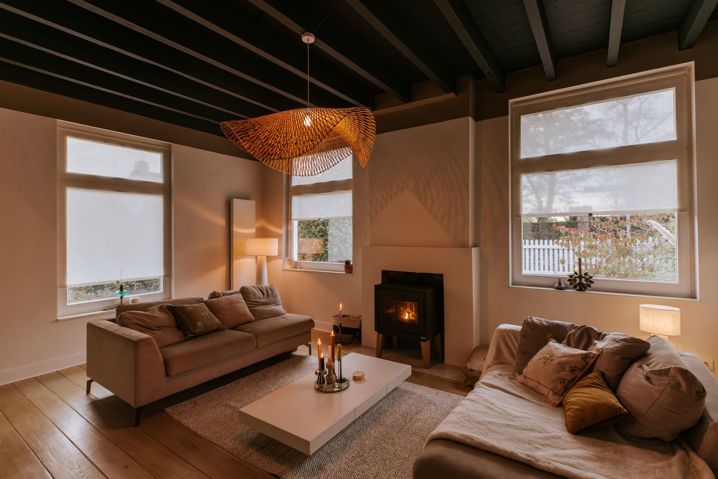 De woonkamer is van alle ruimtes in huis voor ons misschien wel de meest sfeervolle kamer in huis. Hier zien wij een heerlijke plek voor lange winteravonden bij de kachel. Een ruime kamer met drie grote ramen waar in het voor- en najaar de middag- en avondzon naar binnen valt. Bij de massief eikenhouten plankenvloer, de pelletkachel én het houten balkenplafond is het niet moeilijk om een gedecoreerde kerstboom voor te stellen en te zien wat wij bedoelen met "misschien wel de meest sfeervolle kamer in huis". In deze kamer komt de hele vibe van het huis in optima forma samen.