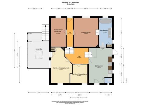 Beneden bereiken we de centrale hal van een woonlaag, die bruist van de mogelijkheden. Aan deze hal grenzen een ruime bijkeuken, twee kantoor-/slaapkamers en een prachtige stenen trap naar het wat hoger gelegen slaapgedeelte.
