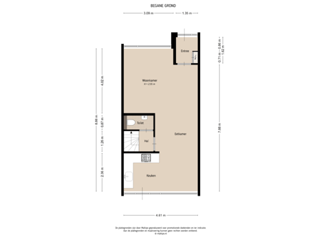 Ontvangsthal met meterkast en toegang tot de straatgerichte woonkamer. Eetkamer gedeelte en een tuingerichte keuken met inbouwkeuken en toegang tot de achtertuin. De tussenhal met trapopgang naar de eerste verdieping en de toiletruimte is toegankelijk vanuit het tussengedeelte tussen de keuken en woonkamer.