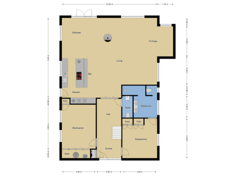 Bij een woning van dit kaliber mag een uitgebreide eilandkeuken natuurlijk niet ontbreken. De opstelling bestaat uit 3 delen, namelijk een spoelgedeelte aan de wand en het raam, een kookeiland met open karakter naar de living en een hoge kastenwand die fraai in de wand is weggewerkt. Een natuurstenen werkblad en matzwarte fronten geven de keuken een trendy uitstraling. Tevens is er gekozen voor luxe inbouwapparatuur zoals een Bora inductie kookplaat met geïntegreerde afzuigunit en een tepanyaki grillplaat. Twee ovens (waarvan 1 met stoomfunctie), een bordverwarmer en een vacuümeermachine, een klimaat (wijn)kast, een vaatwasser, een maximaal hoge koelkast en een separate vriezer (4 lades) maken het arsenaal aan inbouwapparatuur compleet. En natuurlijk ontbreekt de Quooker niet die voor direct kokend water zorgt. Speels is de eilandopstelling in combinatie met de bar. De maar liefst 6 barkrukken worden ter overname aangeboden. Een extra tuindeur in de zijgevel geeft zowel toegang tot het buitenterras als tot de tuinkamer.