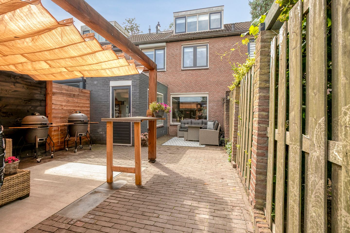 De zonnige achtertuin is onderhoudsvriendelijk aangelegd met fraai straatwerk en een groot zonneterras aan de achtergevel. Aansluitend aan de berging is een 2e zonneterras gerealiseerd. Het is mogelijk om dit zonneterras overdekt te maken via het schuifbare schaduwdoek. Aan de achterzijde van de tuin is de stenen berging (circa 6 m2) gelegen. Ook heeft de tuin een handige achteringang.
