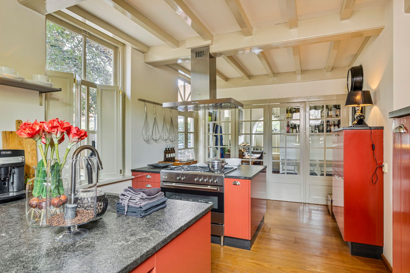 Via de entree aan de voorzijde kom je in een ruime hal die toegang geeft tot een grote woonkeuken en de trap naar de verdieping. De keuken is voorzien van alle apparatuur met een houten vloer. De keuken zelf is rood met een zwart natuursteen werkblad. Ook bevindt zich hier een kamer welke thans gebruikt wordt als kantoor.