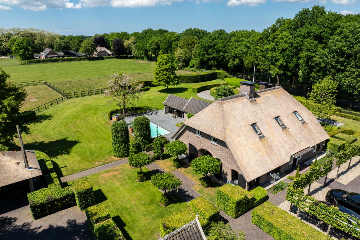 De omheinde landerijen met hooiberg bieden volop ruimte voor weidegang, training of recreatie en zijn met zorg ingericht voor optimaal gebruik. Twee elektrische toegangspoorten geven toegang tot het erf, wat zorgt voor zowel veiligheid als comfort. De klassiek aangelegde boerderijtuin biedt meerdere zichtlijnen met hagen, platanen en hortensia’s en sluit naadloos aan op de landelijke architectuur. Naast het landhuis vindt u een verwarmd buitenzwembad met een stijlvol origineel bakhuis, royaal terras en sfeervolle overkapping – een idyllische plek voor lange zomerdagen in volledige privacy.