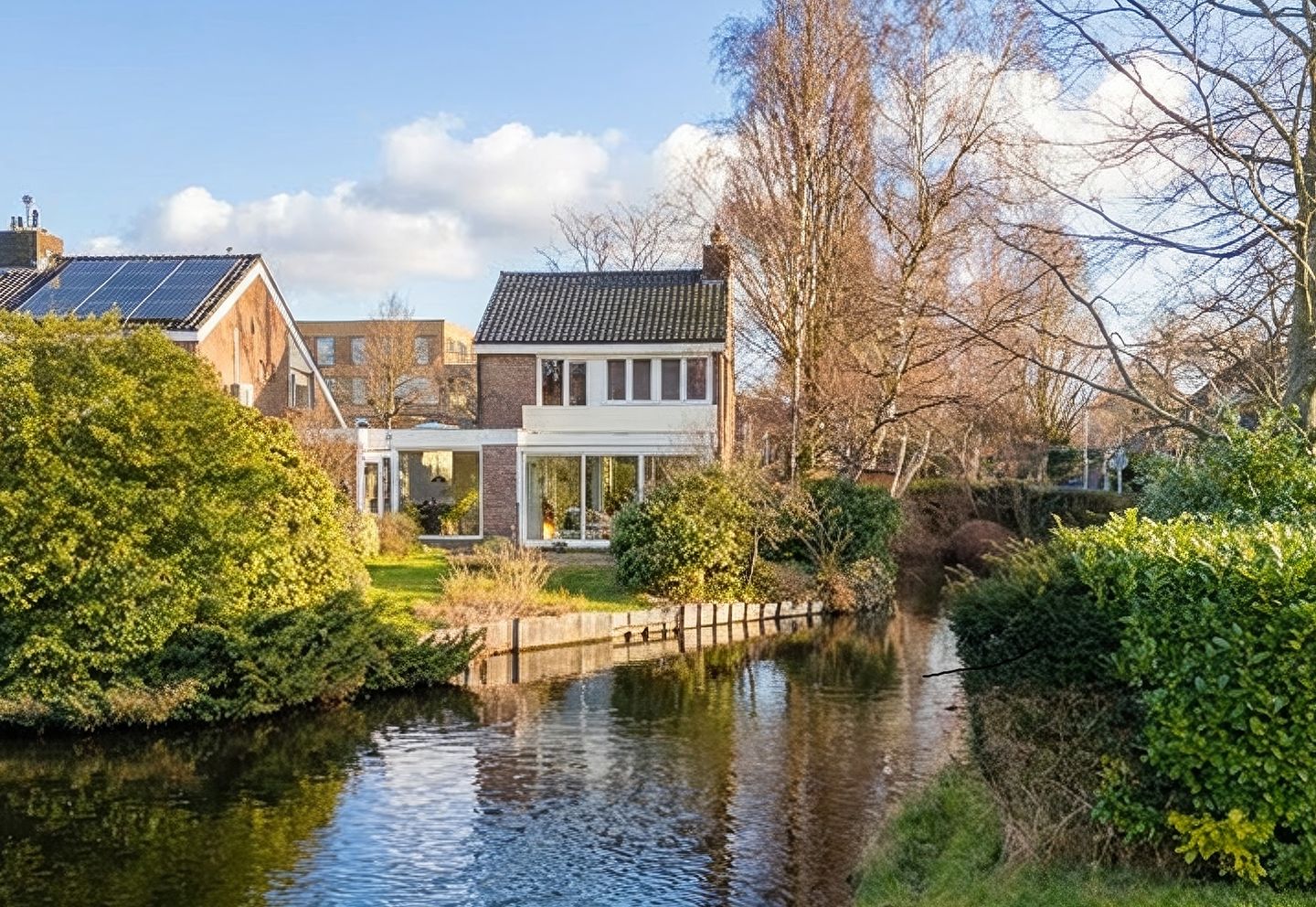 Ruime geschakelde woning met serre, werkruimte en tuin aan het water.