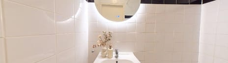 De badkamer is voorzien van een douche, een wastafel met meubel en een moderne spiegel met licht en verwarming.