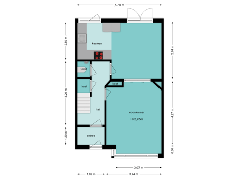 - 50 m² (8,60 meter diep en 5,80 meter breed)