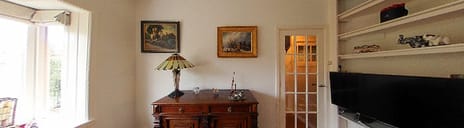 Entrance/vestibule with cloakroom and original wall tiles, hallway with staircase, under-stairs cupboard with meter cupboard (9 groups + 2 earth leakage switches), wall-hung toilet with washbasin. Living/dining room en suite with original stained-glass sliding doors. The front room has a bay window, a built-in cupboard and an elegant natural stone mantelpiece. The dining room is located at the rear with French doors to the garden. Both the hallway and living/dining room have oak flooring. The open-plan kitchen (2018) is in an L-shape, with a granite worktop, large fridge, freezer with drawers, oven, dishwasher, induction hob and extractor hood. The sunny south-facing garden is accessible via the back door and includes a brick shed and rear entrance.