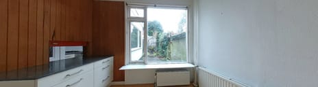 Entree, hal met toegang tot de lichte woonkamer met en-suite indeling. De grote ramen zorgen voor veel daglicht en een prettige sfeer. Aan de achterzijde bevindt zich de keuken, met daarachter een uitbouw die ideaal is als bijkeuken, schuur of zelfs als werkplek. De beschutte stadstuin is bereikbaar via een achterom, een fijne plek om buiten te zitten.