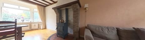De lichte woonkamer heeft een gezellige zithoek met een sfeervolle houtkachel en openslaande deuren naar de achtertuin. Aan de voorzijde bevindt zich het eetgedeelte met parketvloer, een fijne plek voor lange avonden met familie of vrienden. Onder de trap bevindt zich een trapkast met groepenkast, tevens handig voor extra bergruimte.