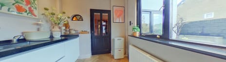 In de uitgebouwde keuken aan de achterzijde treft u een ruime, moderne opstelling voorzien van Siemens inbouwapparatuur: een vijfpits gasfornuis, afzuigkap, vaatwasser, combimagnetron, koelkast en diverse ladekasten. Vanuit de keuken is de handige bijkeuken bereikbaar, met een diepe kast waar de wasmachine en droger keurig uit het zicht staan. Ook is er een deur naar de achtertuin.
