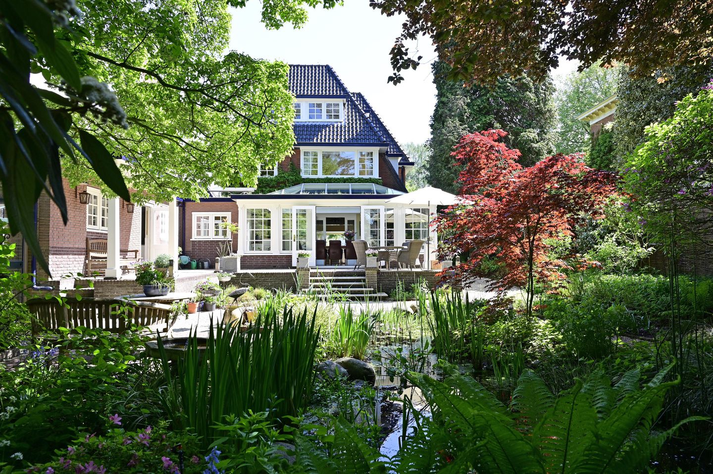 En wát een tuin! De achtertuin, ruim 37 meter diep, met een natuurlijk aangelegde vijver als middelpunt, lijkt rechtstreeks uit een woonmagazine te komen. Dankzij meerdere zitplekken en wandelpaden ontdek je elke keer weer een ander uitzicht – van weelderig groen tot knusse hoekjes waar je heerlijk kunt lezen of van de zon genieten. Het feit dat alle tuinen (voor, zij én achter) voorzien zijn van een geautomatiseerde sproei-installatie maakt het onderhoud net zo eenvoudig als het heerlijk vertoeven.
