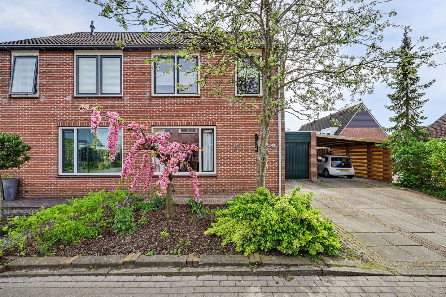 Aan de zijkant van de woning bevindt zich de garage, die vanuit de tuin toegankelijk is. Tevens is er via de zijkant toegang tot de oprit en de carport. De ruime oprit naast de woning biedt plaats aan meerdere auto’s en leidt naar de garage, ideaal voor hobbyisten of extra bergruimte.