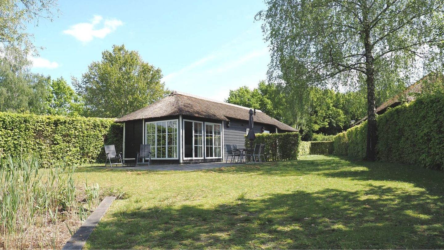Op het mooiste plekje van recreatiepark De Tolplas staat dit 6-persoons chalet met rieten dak.