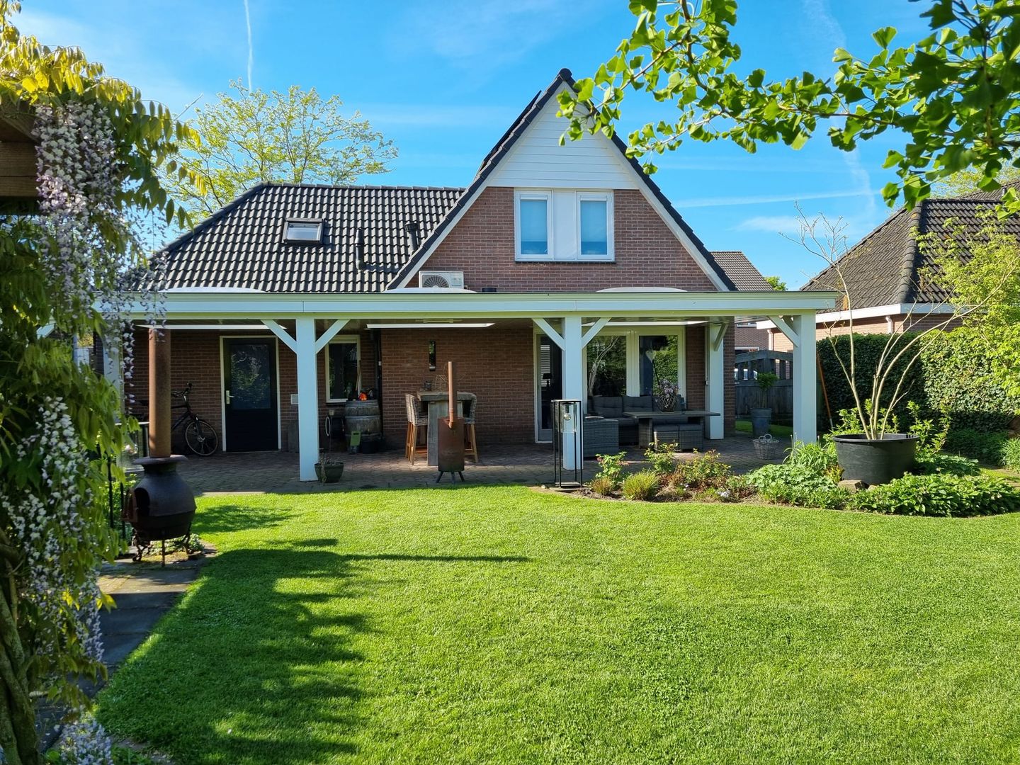 Aan de achterzijde van de woning is in 2021 een robuuste, ruime overkapping gerealiseerd met 3 lichtkoepels en ingebouwde verwarmings-elementen.