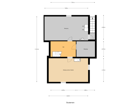 Souterrain: In de centrale hal met plaatsing van de waterontharder de trap naar de begane grond. Vanuit deze hal naar de provisiekelder, een verwarmde hobbyruimte/atelier of speelkamer met klein keukenblokje en de toegang naar de berging met plaatsing van het witgoed, de cv-ketel en het waterfilter. Deze laatste ruimte is ook rechtstreeks vanuit de tuin bereikbaar.