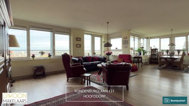 Wat een ruimte en wat een uitzicht! De royale woonkamer geniet van veel natuurlijk licht dankzij de grote raampartijen. Vanuit de woonkamer heeft u toegang tot het aangrenzende balkon, waar u kunt genieten van een prachtig uitzicht over Hoofddorp.