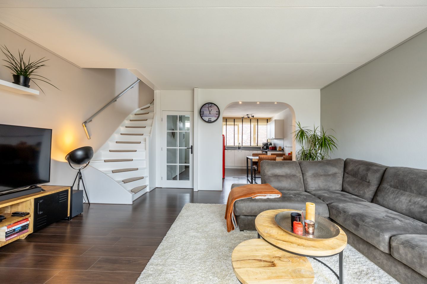 At the front of the living room is a semi-open kitchen in light tones, equipped with various (built-in) appliances: 5-burner gas hob, extractor fan, oven, dishwasher, and fridge/freezer combination. The kitchen also includes the washing machine connection.