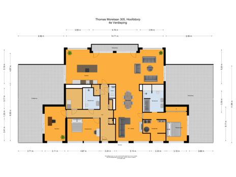 Daarnaast heeft het penthouse nog een gastentoilet en een technische ruimte met de opstelplaats van de warmtepomp en de wasmachine en droger aansluiting.