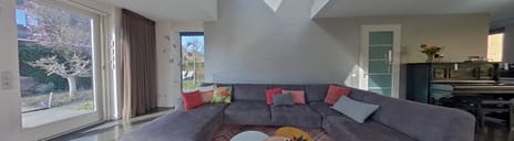 De lichte woonkamer, gelegen aan de rechterzijde, beschikt over een sfeervolle open haard en openslaande deuren naar de achtertuin. Het hoge plafond en de grote ramen zorgen voor een ruimtelijk gevoel. Aan de linkerzijde van de woning bevindt zich de eetkamer, die eveneens toegang biedt tot de tuin en naar de keuken leidt. De keuken heeft een fijne opstelling met aan de rechterzijde de 5-pits inductiekookplaat en de gootsteen met een Quooker. Aan de linkerzijde vindt u de vaatwasser, combimagnetron, oven en bordenwarmer.