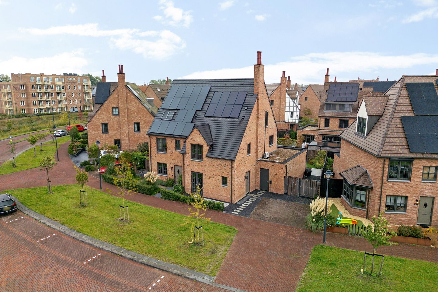 In the young Tudorpark district there is this EXTENDED SEMI-DETACHED HOUSE built in 2022 in the recognizable English Tudor style. In addition to the very spacious living room and luxurious Siematic kitchen, the house has FOUR well-sized bedrooms, a hobby/storage room and TWO bathrooms. The entire house is equipped with underfloor heating and cooling. Two cars can be parked next to each other on site and in the wide backyard, which has also recently been constructed, you can enjoy the evening sun until late.
