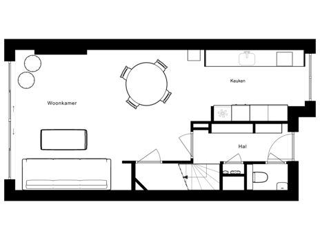 Via de verzorgde voortuin komt u binnen in de hal met garderobe, meterkast, moderne toiletruimte met fontein en trapopgang. De sfeervolle woonkamer bevindt zich aan de achterzijde en is voorzien van een elektrische haard en schuifpui naar de tuin. Aan de voorzijde ligt de moderne open keuken, uitgerust met hoogwaardige inbouwapparatuur (waaronder Bora inductiekookplaat, Quooker, combi-oven, vaatwasser en koel-/vriescombinatie van Siemens Studioline).